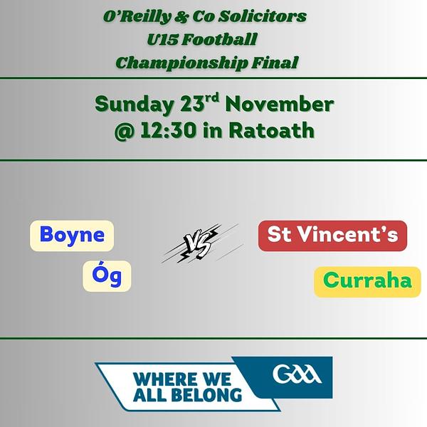 Boyne Óg (the combined forces of Longwood, Clonard and Ballinabrackey) have enjoyed an excellent first season and look to end it in style when they face St Vincent's/Curraha in the U15 Football Championship Final on Sunday afternoon.